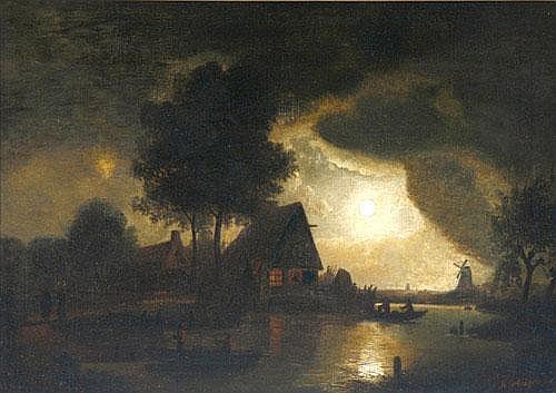 | Abendliche holländische Flusslandschaft im Schein des Vollmondes, auf dem Fluss heimkehrende Fischer in ihren Booten | |