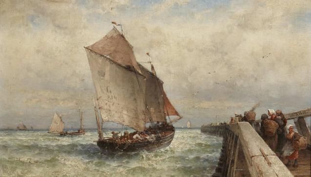 Figures on a wharf with sailing vessels offshore