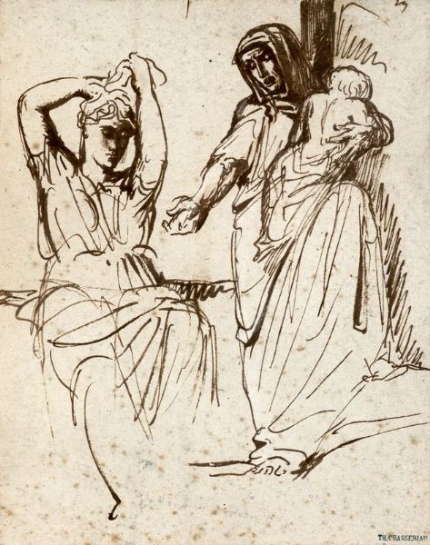 | Étude de femme se coiffant et de mendiante et son bébé, Italie 1840 | |