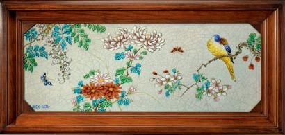 Panneau en faïence à décor polychrome émaillé de fleurs