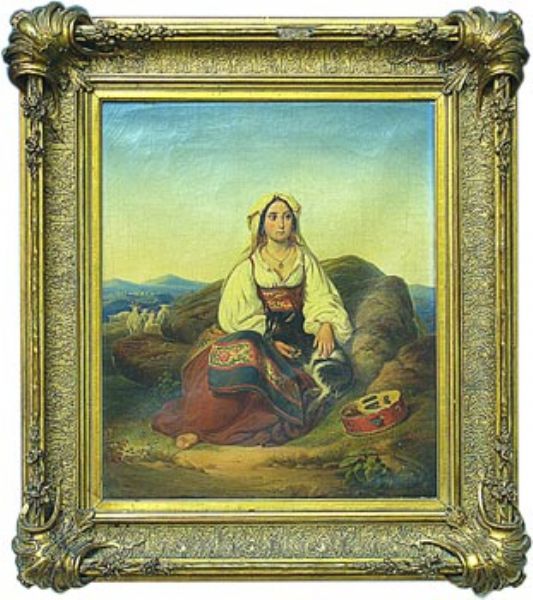 | Junge Neapolitanerin mit Zicklein und Tambourin, im Hintergrund weite Hügellandschaft | |