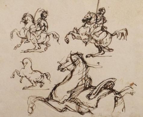 | Etude d'un officier de chasseur à cheval, d'un cuirassier à cheval, d'un cheval cabré et d'un cheval de mameluck se cabrant | |