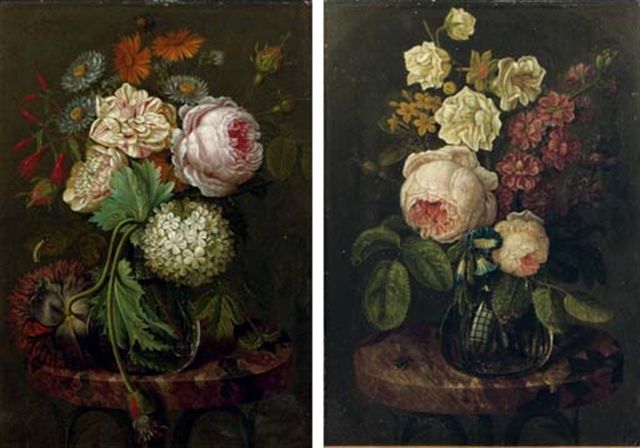 | A pink rose, a hydrangea, yellow heads and other flowers in a glass vase on a table with a marble top; and Pink roses, primroses | |