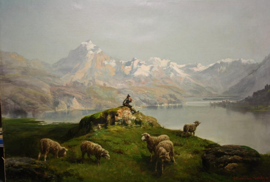 | Berger et ses moutons au bord du lac d'Annecy avec Tournette. | |