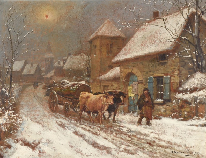 | L'attelage de boeufs, en hiver à la sortie du village | |