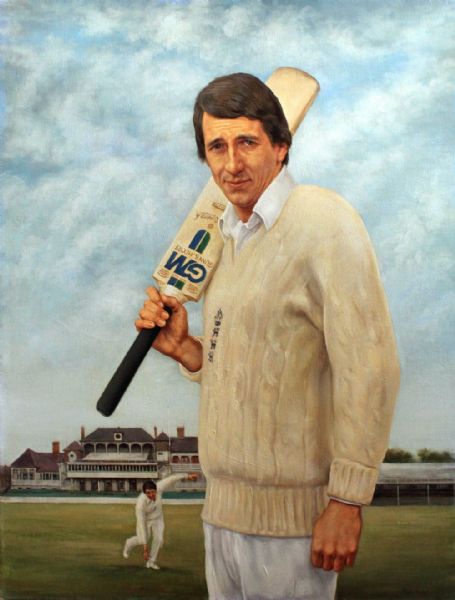 Three quarter length portrait of cricketer, Derek Randall holding a cricket bat