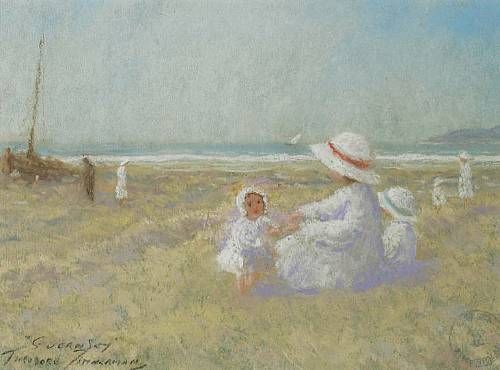 Madame Zimmerman and the children on the beach in Guernsey, C.I