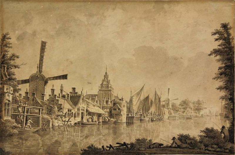 | Village with a church, two mills and boats at a riverside, two anglers in the foreground | |