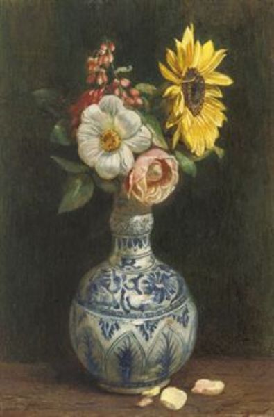 | A sunflower, a rose and other flowers in a blue and white vase | |
