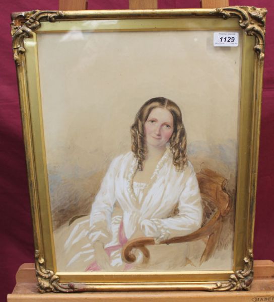 | portrait of Mrs Bramston-Smith in a white gown, seated in a chair | |