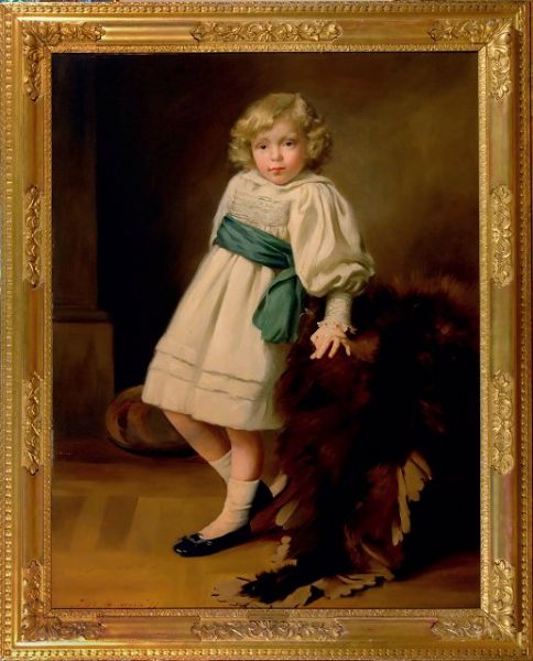 | Full length portrait of a young child wearing a cream dress sitting on a bear skin | |