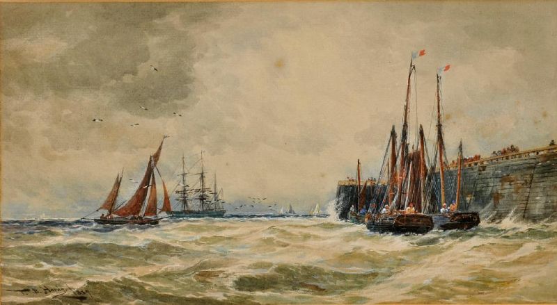 FISHING BOATS OFF A PIER IN WINDY WEATHER