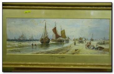 | Off Lowestoft" a study of fishing smacks and another "Katwyke, Holland" a beach scene with figures and fishing boats | |