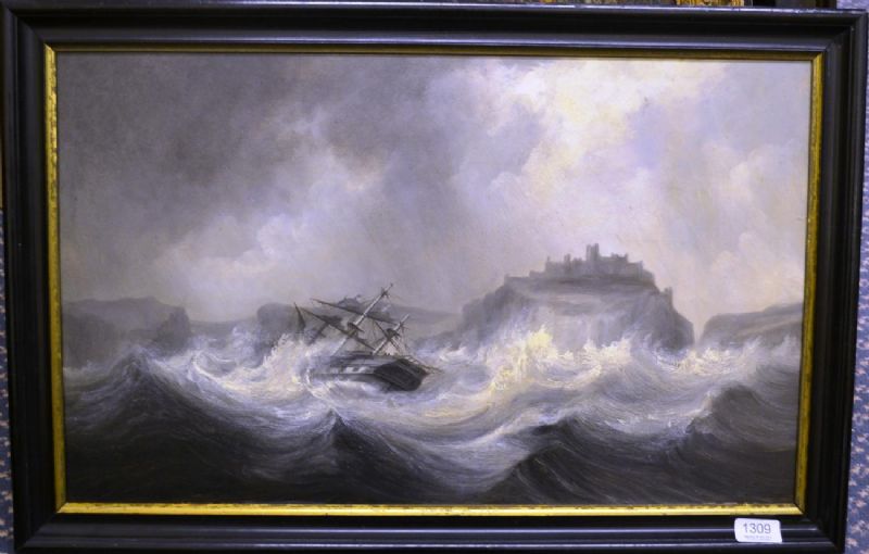 Dismasted vessel in rough seas off Dunstanburgh Castle