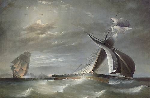 | The night chase: a frigate in hot pursuit of an armed cutter by moonlight off the South Stack lighthouse | |
