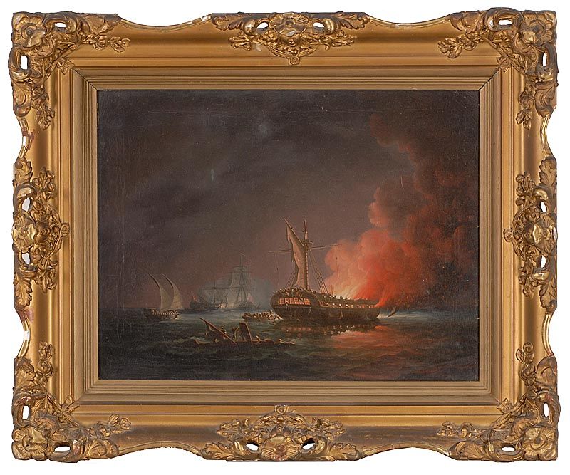 | Dramatic scene of a naval battle at night with a dis-masted warship on fire and a British warship dis-masting another ship in th | |