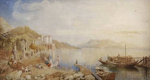 Continental lakeland landscape with figures and boats amidst ruins