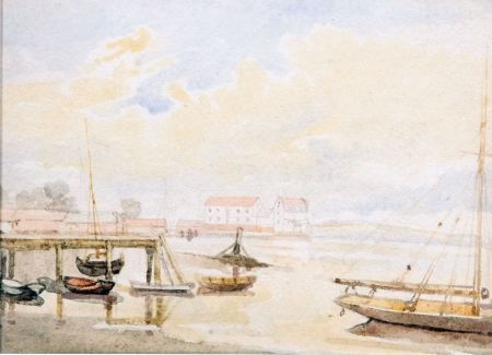 River Scene with Jetty, Figures and Ship