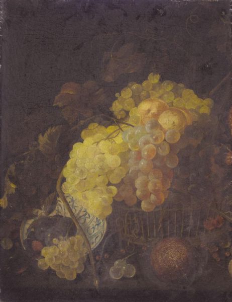 | A STILL LIFE WITH GRAPES AND PEACHES IN A BASKET TOGETHER WITH A PORCELAIN BOWL, PLUMS AND BLACKBERRIES | |