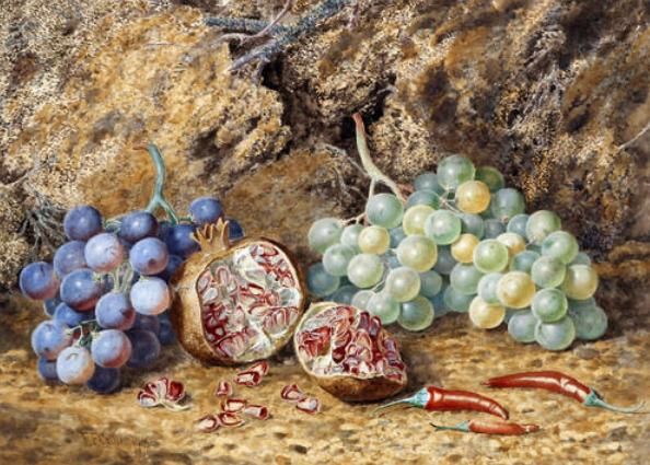 Still life of grapes, pomegranate and chillies