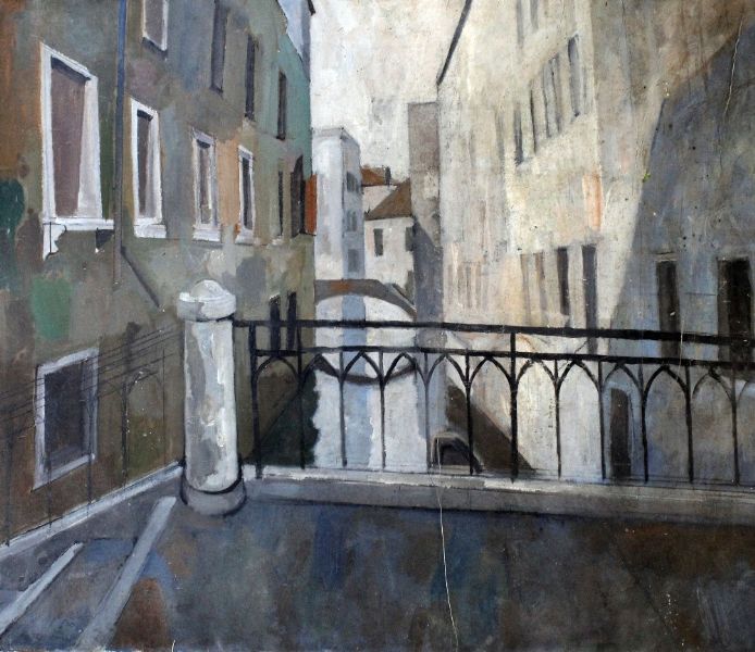 Venetian canal scene with gondola to foreground