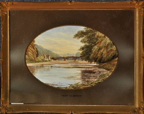 RIVER SCENE WITH CATTLE AND BRIDGE IN THE DISTANCE