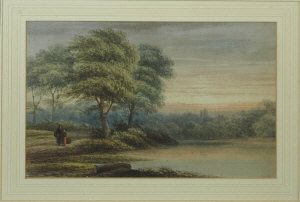 Figures by a river before a town
