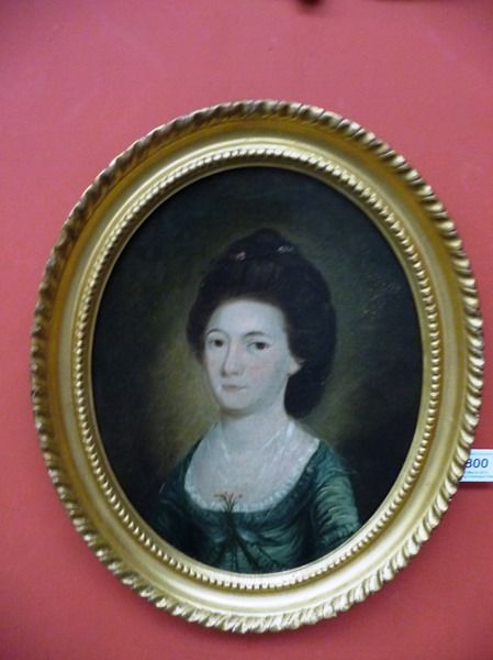 | Portrait of a lady, head and shoulders, wearing a green dress decorated with flowers | |