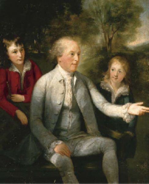 | Portrait of a gentleman, three-quarter-length, seated on a bench in a landscape, with two boys standing on either side | |