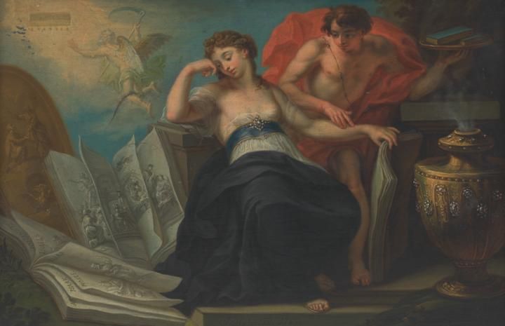 | Neoclassical style scene with central female figure attended by a young man holding books on a tray, open Bibles to the left | |