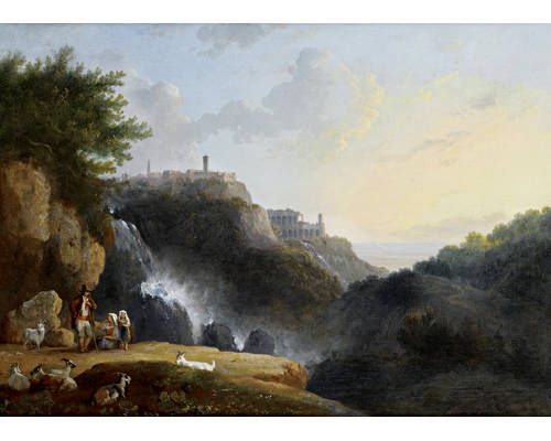 A shepherd and shepherdesses grazing their herd before the Cascatelle at Tivoli with the ruins of the Sanctuary of Hercules Vict