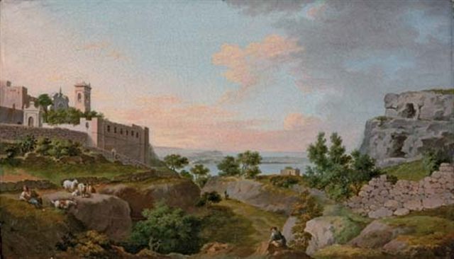 | An Italianate landscape with a monastery, herders in the foreground | |