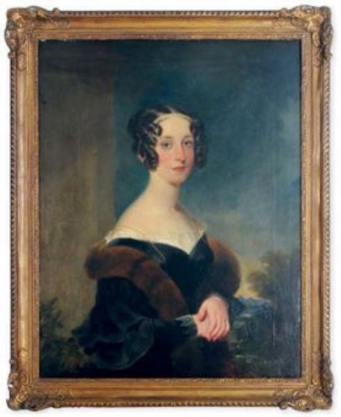 Portrait of a lady, wearing a fur stole, a landscape beyond