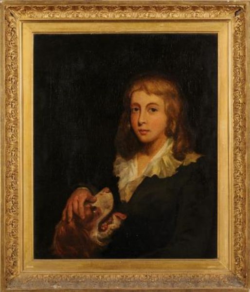 | Portrait of a youth with shoulder-length hair, wearing a ruff collar, his hand resting on a hound | |