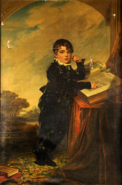 | Portrait of John Garratt Junior, aged eight and half years, standing full length, his right hand resting on an open bible, lands | |