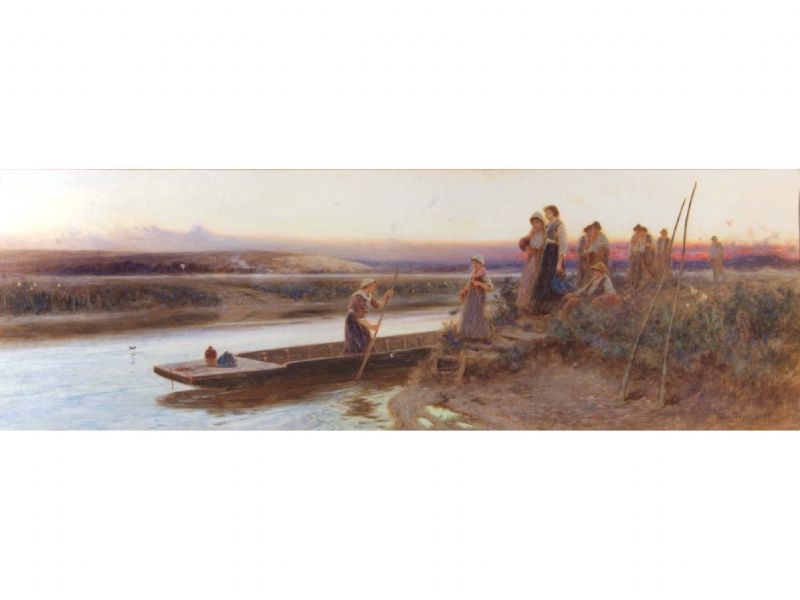 | A scene at sunset with agricultural workers journeying home, stepping into a punt | |