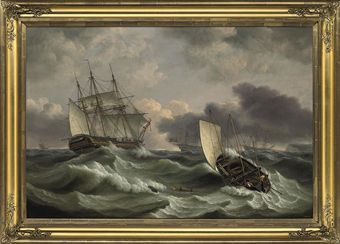 | Two Royal Naval Third Rates anchored and sheltering in Torbay, with a merchantman running past them down the Channel | |