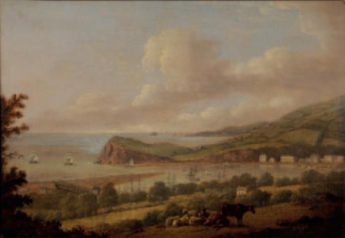 | View to Shaldon from above Teignmouth, cattle and sheep in the foreground, shipping in the harbour beyond | |