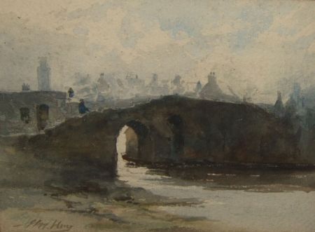 Figure on an Old Stone Bridge with Town Beyond