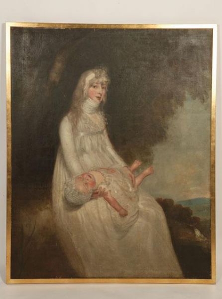 | A portrait of a lady with a child resting in the shade of a tree, an extensive landscape beyond | |