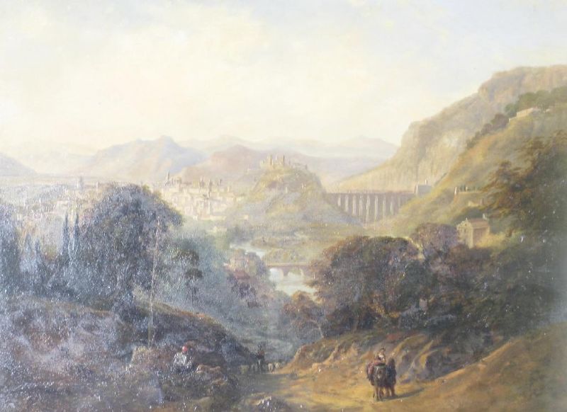 | A mountainous landscape with figures on a track in the foreground, the buildings of a town beyond | |