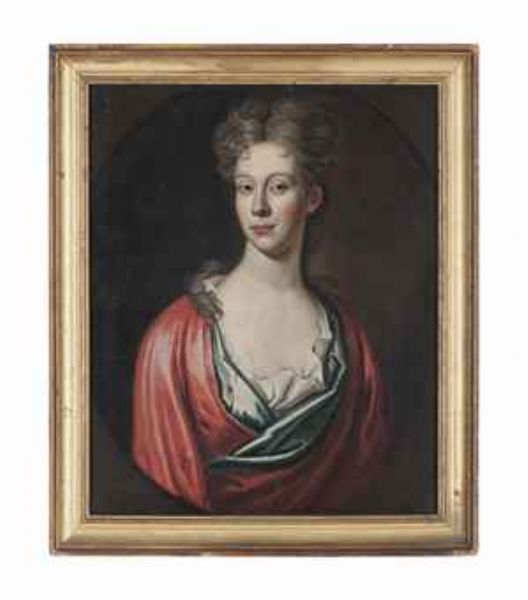 Portrait of a lady, half-length, in a blue dress with a red wrap