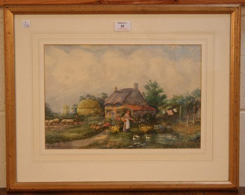 | Lady feeding Ducks outside a Thatched Cottage, a Shepherd, Flock, Haystack and Church beyond | |