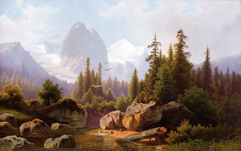 PEJZAŻ ALPEJSKI Z ORŁAMI NAD STRUMIENIEM