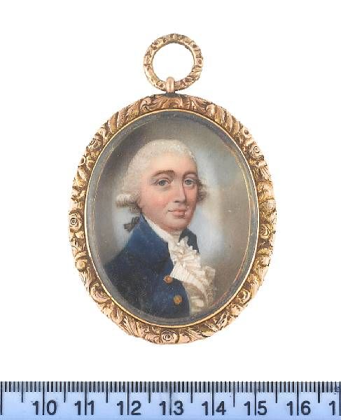 | A Gentleman, wearing blue coat, white waistcoat, frilled chemise and stock, his powdered wig worn en queue and tied with a black | |