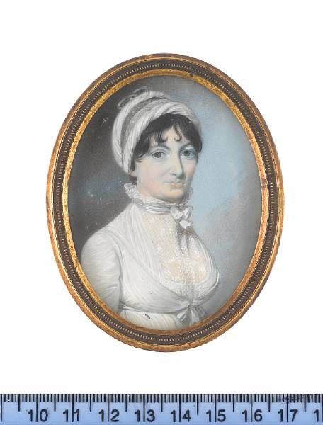 | A Lady, wearing white dress, lace fill-in tied at her neck with ruff and white turban. | |