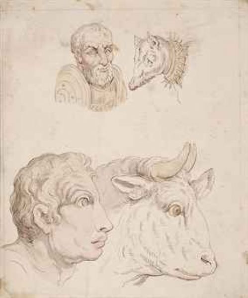 | Studies of the heads of a bull, a male warrior, a male figure and a dog | |