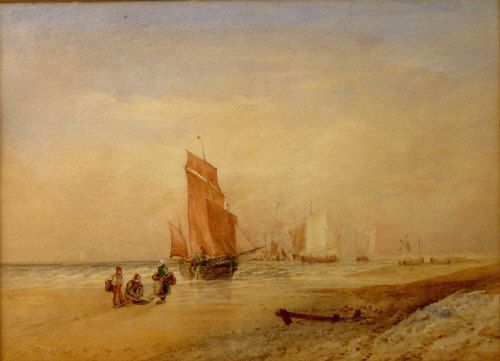 FISHING BOATS OFFSHORE AND A GROUP OF FISHERFOLK ON A BEACH IN THE FOREGROUND