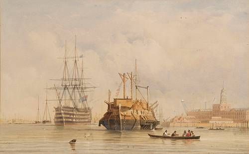 Prison hulk and Naval vessels in Portsmouth harbour