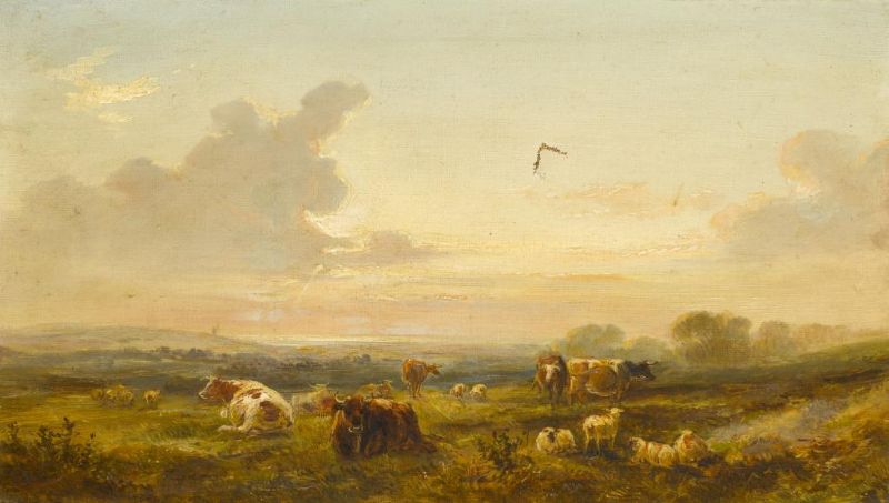 LANDSCAPE WITH CATTLE AND SHEEP AT SUNSET